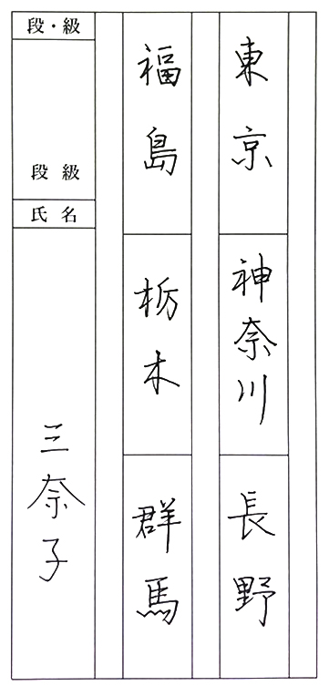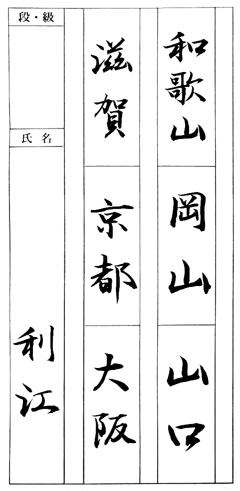 【秀作】各文字の余白に気を配り、工夫を凝らした用筆が感じられました。起筆から運筆にかけて迷いがなくなると、線質がいっそう強く引き締まり、さらなる上達が期待されます。