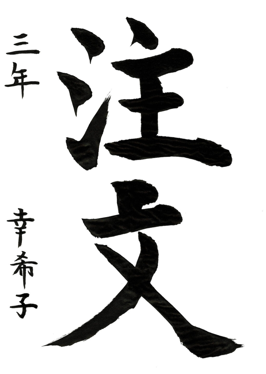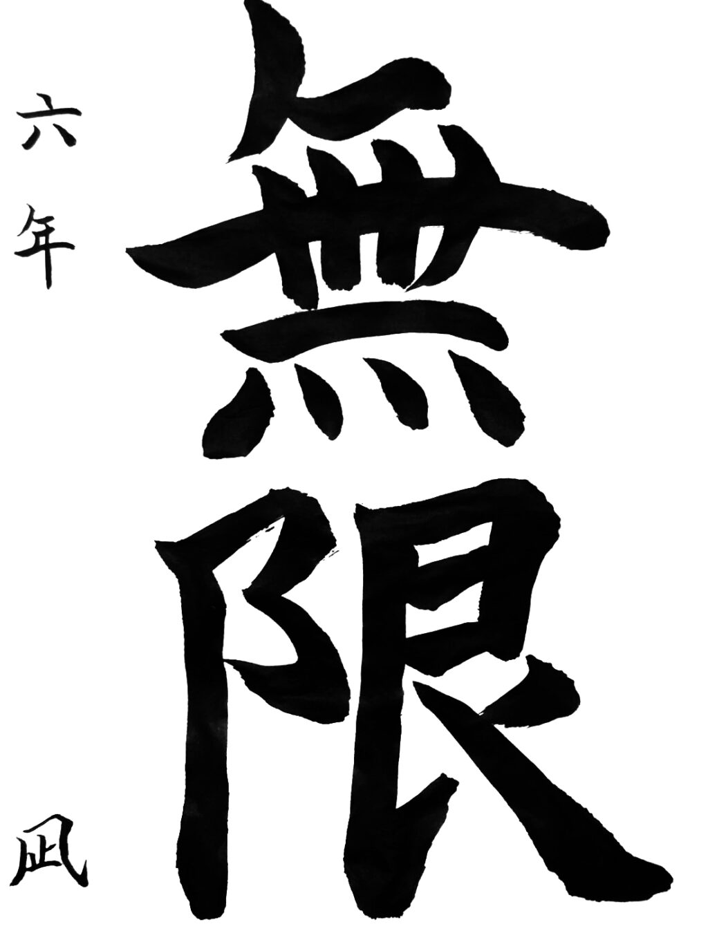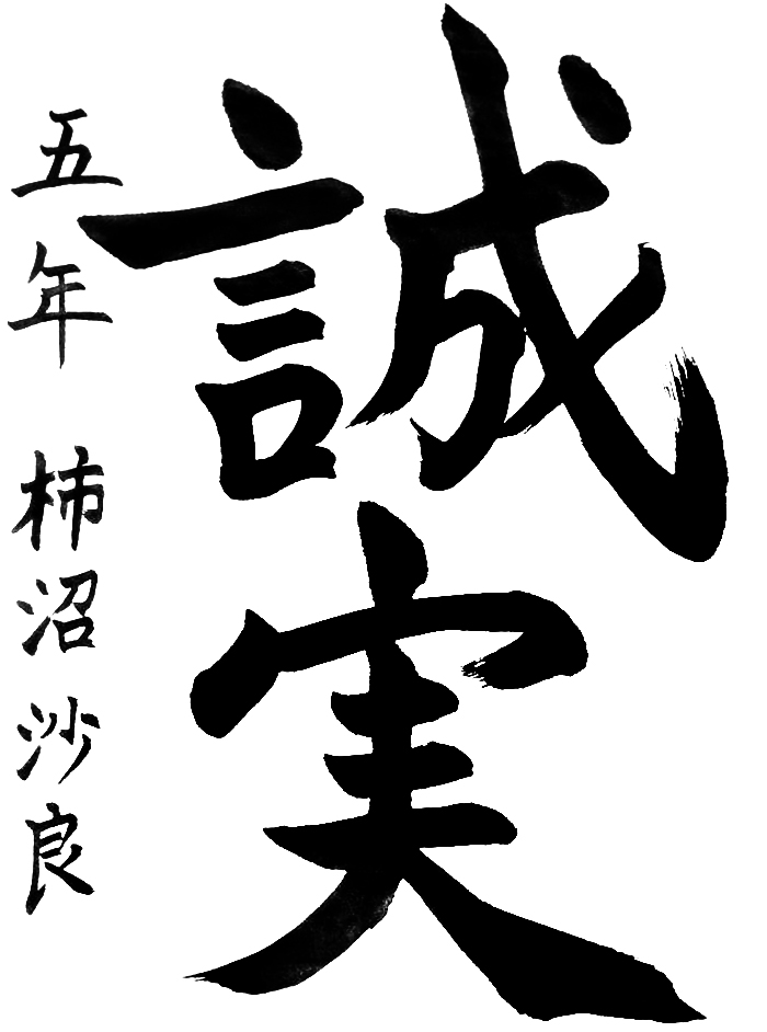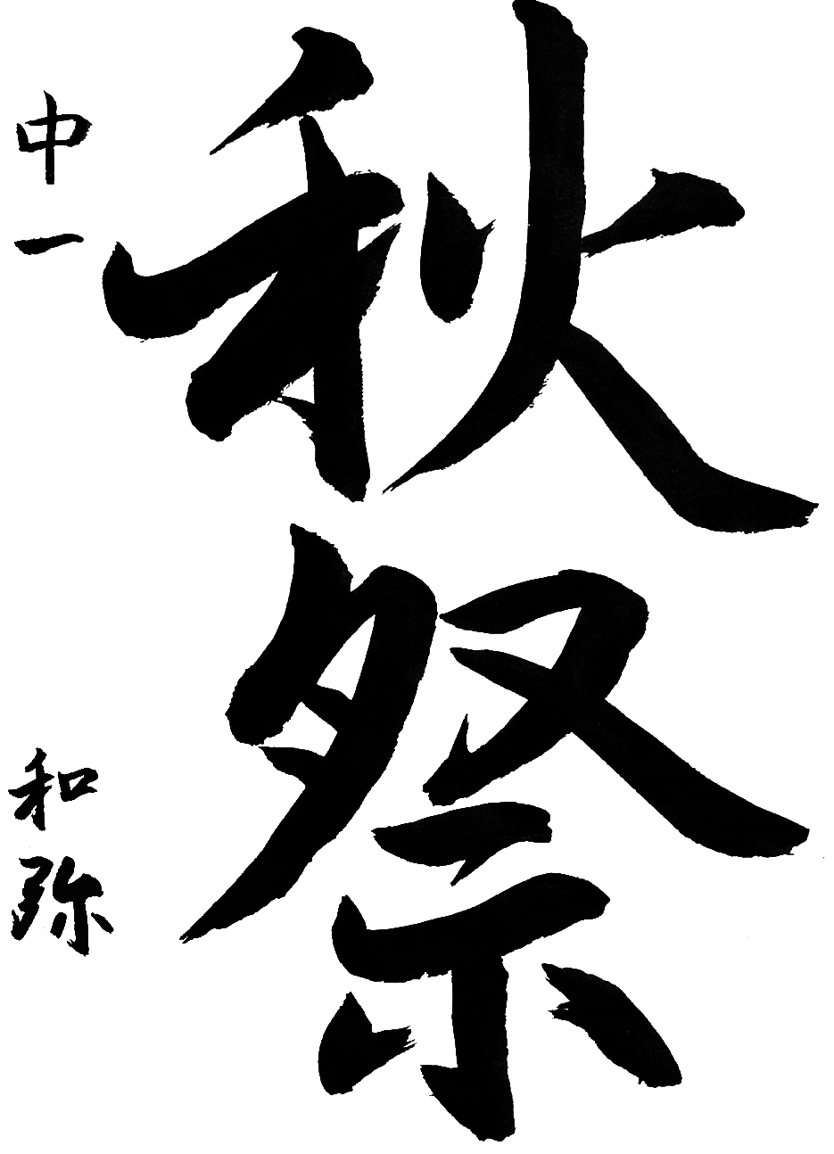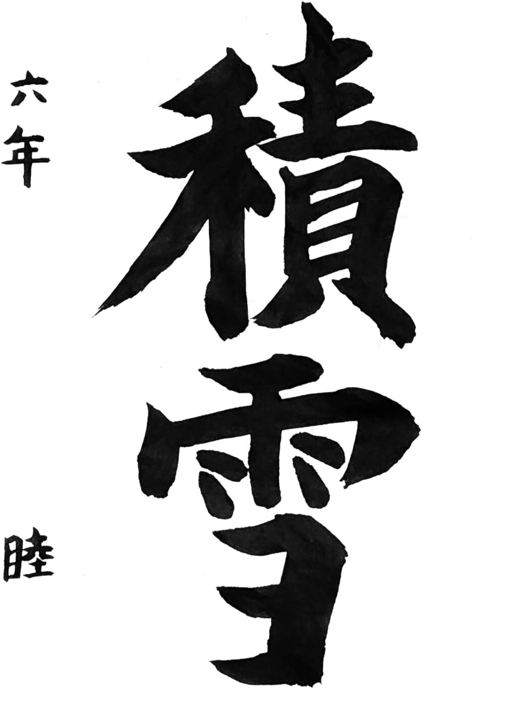 【特選】造形のバランスをしっかりとイメージし、迷いのない思い切った運筆で表現できました。紙面全体を有効に使い、堂々とした印象を与(あた)えています。小筆書きの線質も見事でした。
