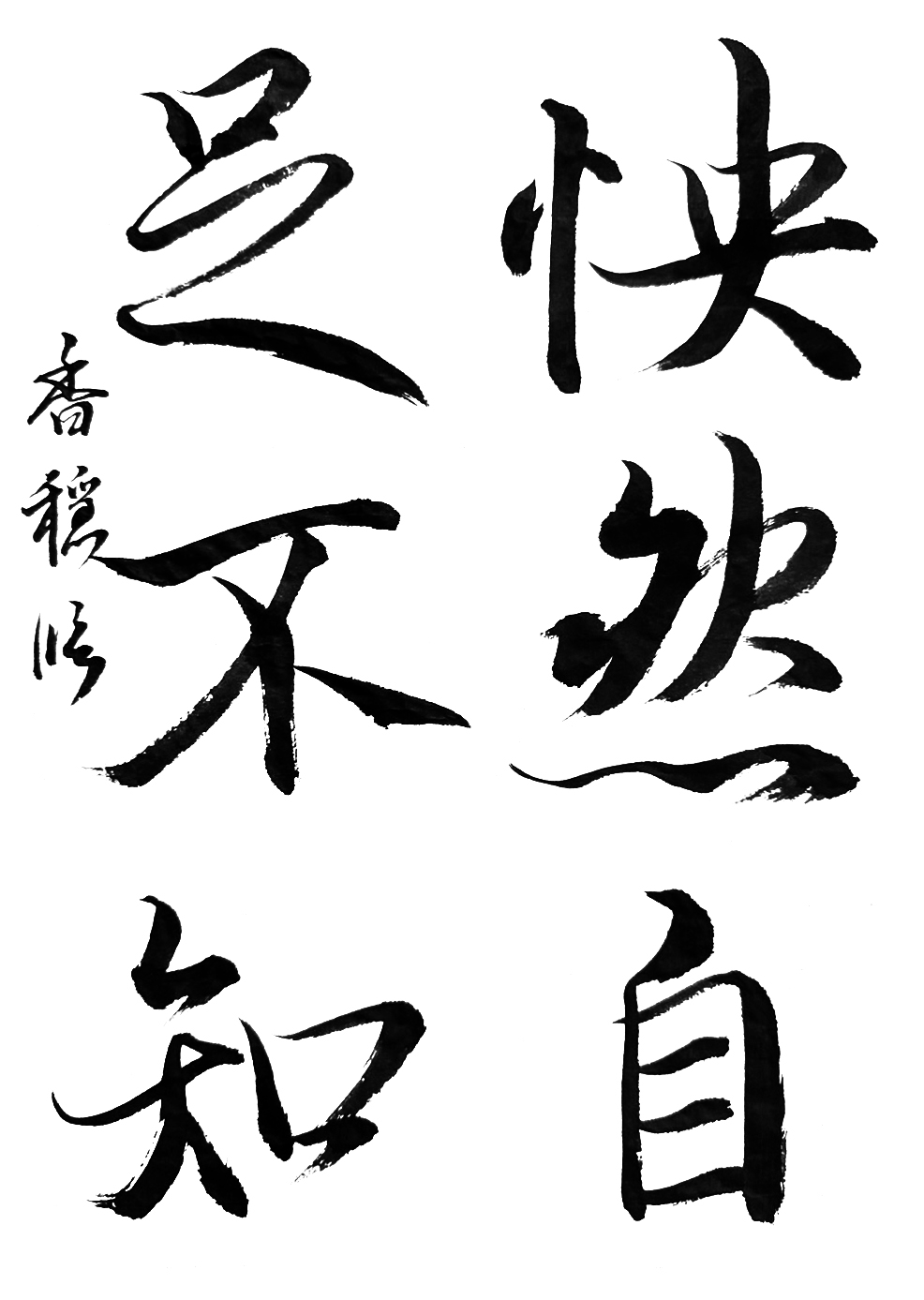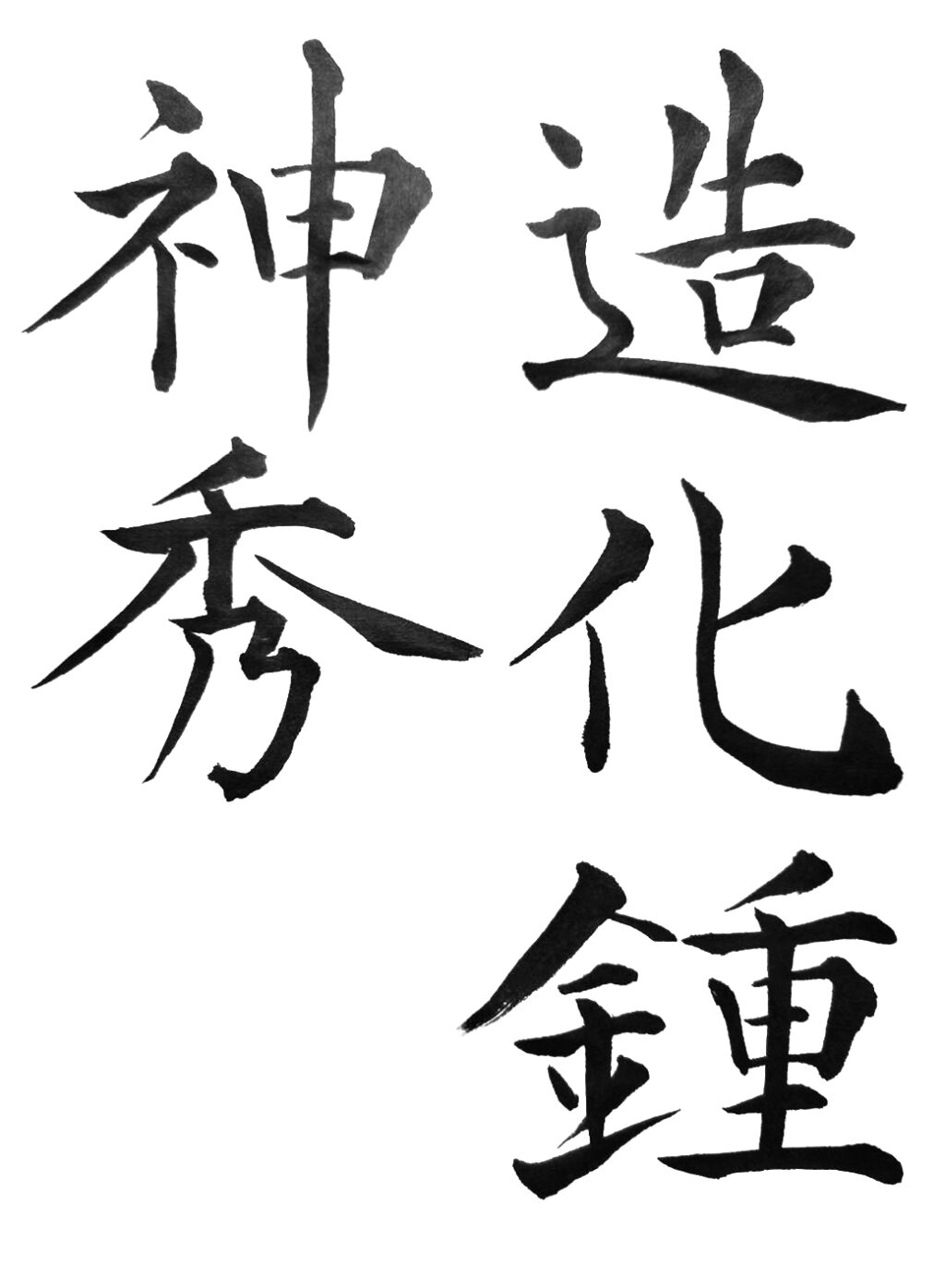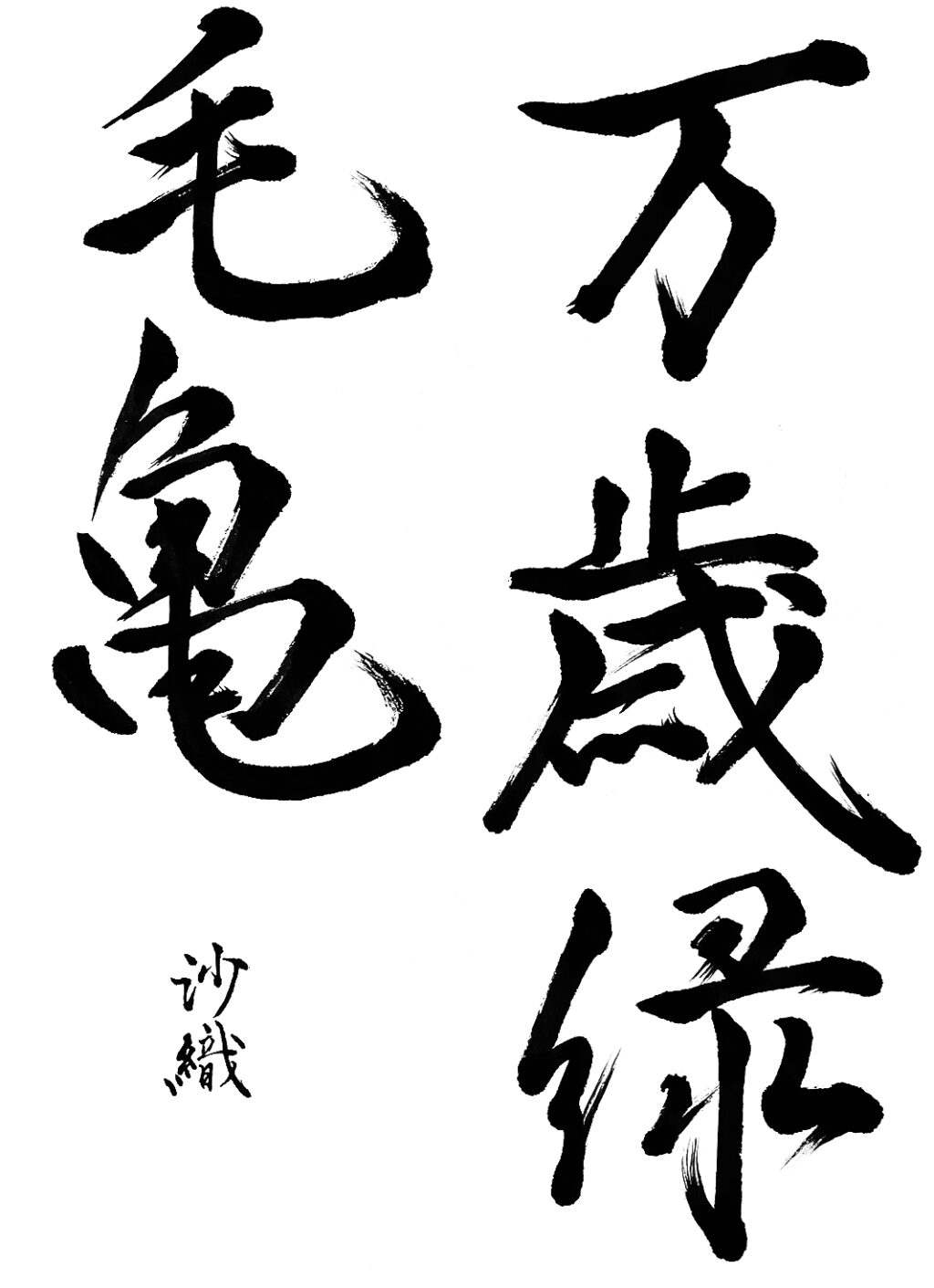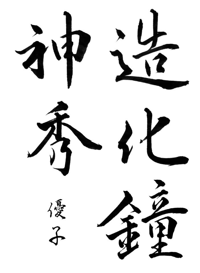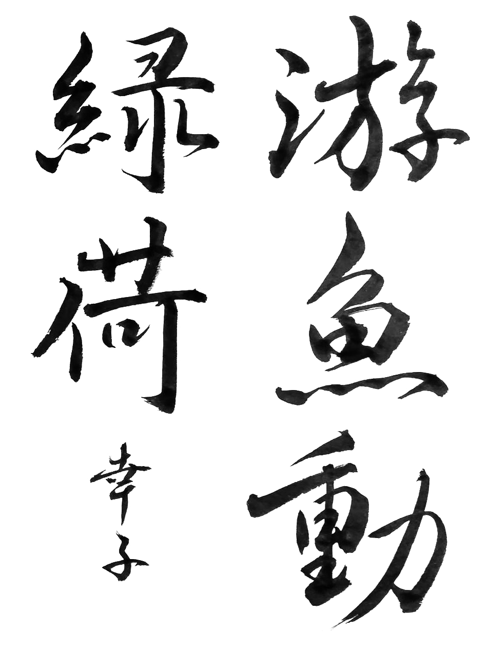 【特選】造形のバランスをしっかりとイメージし、迷いのない思い切った運筆で表現できました。紙面全体を有効に使い、堂々とした印象を与(あた)えています。小筆書きの線質も見事でした。