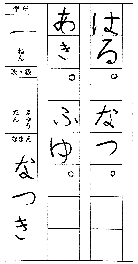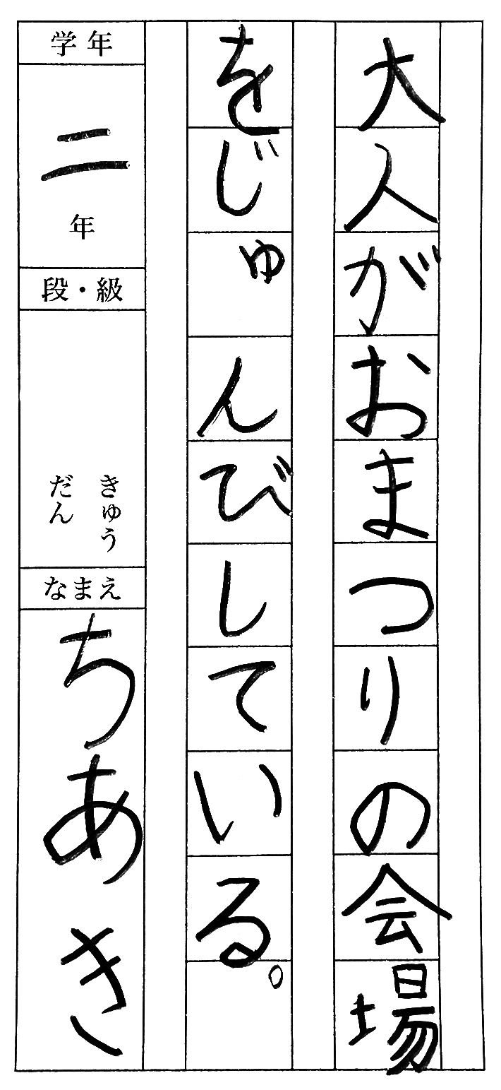 句点(くてん)も丁寧(ていねい)に、各(かく)文字は線(せん)の方向(ほうこう)や余白(よはく)に気を配(くば)って仕(し)上げることができました。今後(こんご)は、枠(わく)いっぱいに大きくのびのびと書(か)く姿(すがた)も楽(たの)しみにしています。