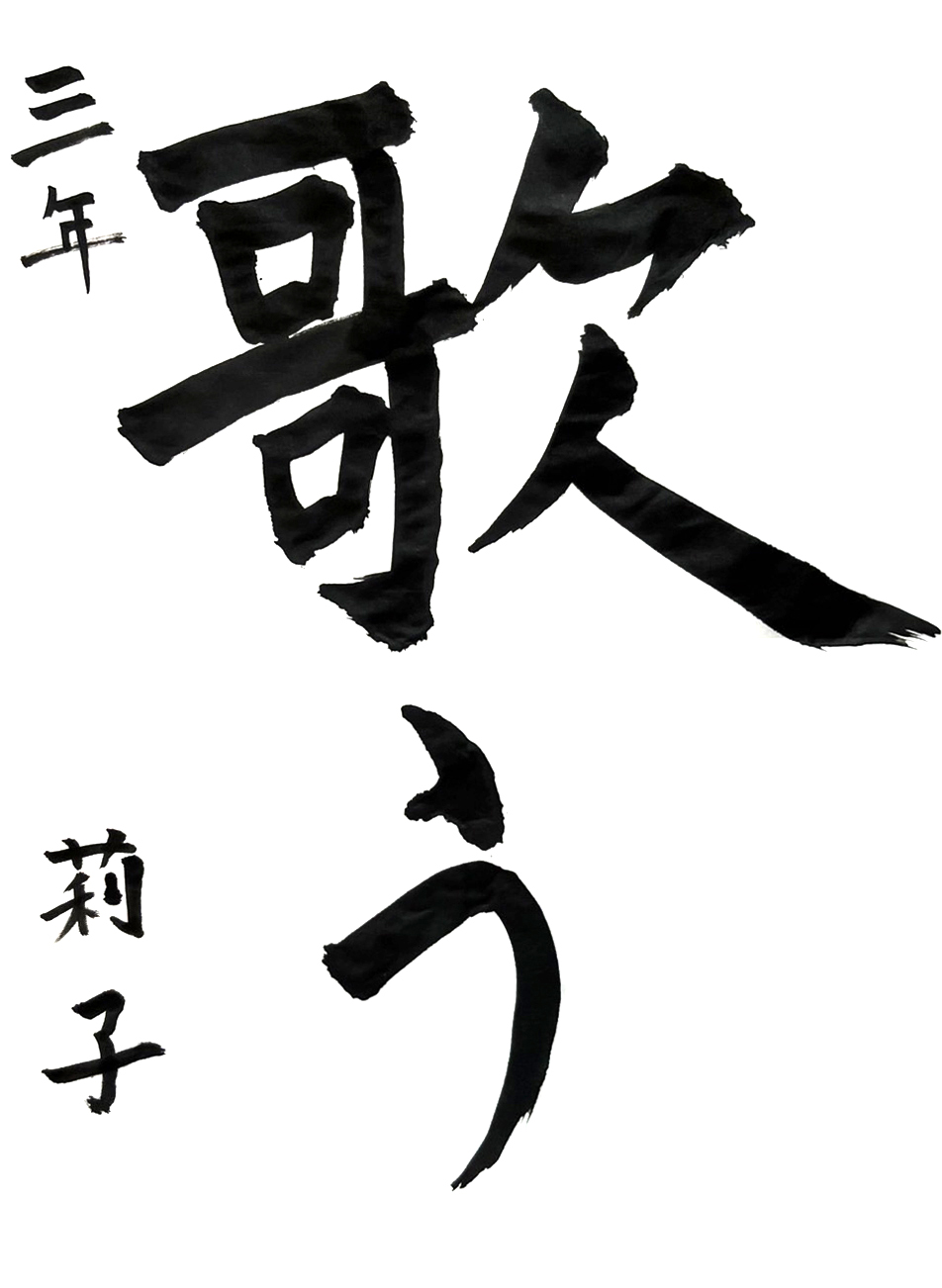【秀作】偏(へん)と旁(つくり)のある漢字の重心バランスの変化(へんか)を上手に表現できました。「う」の縦長(たてなが)の形がより強調されると、さらに素(す)晴らしくなります。小筆書きの大きさのバランスも整い、全体のまとまりがとても良(よ)くなりました。