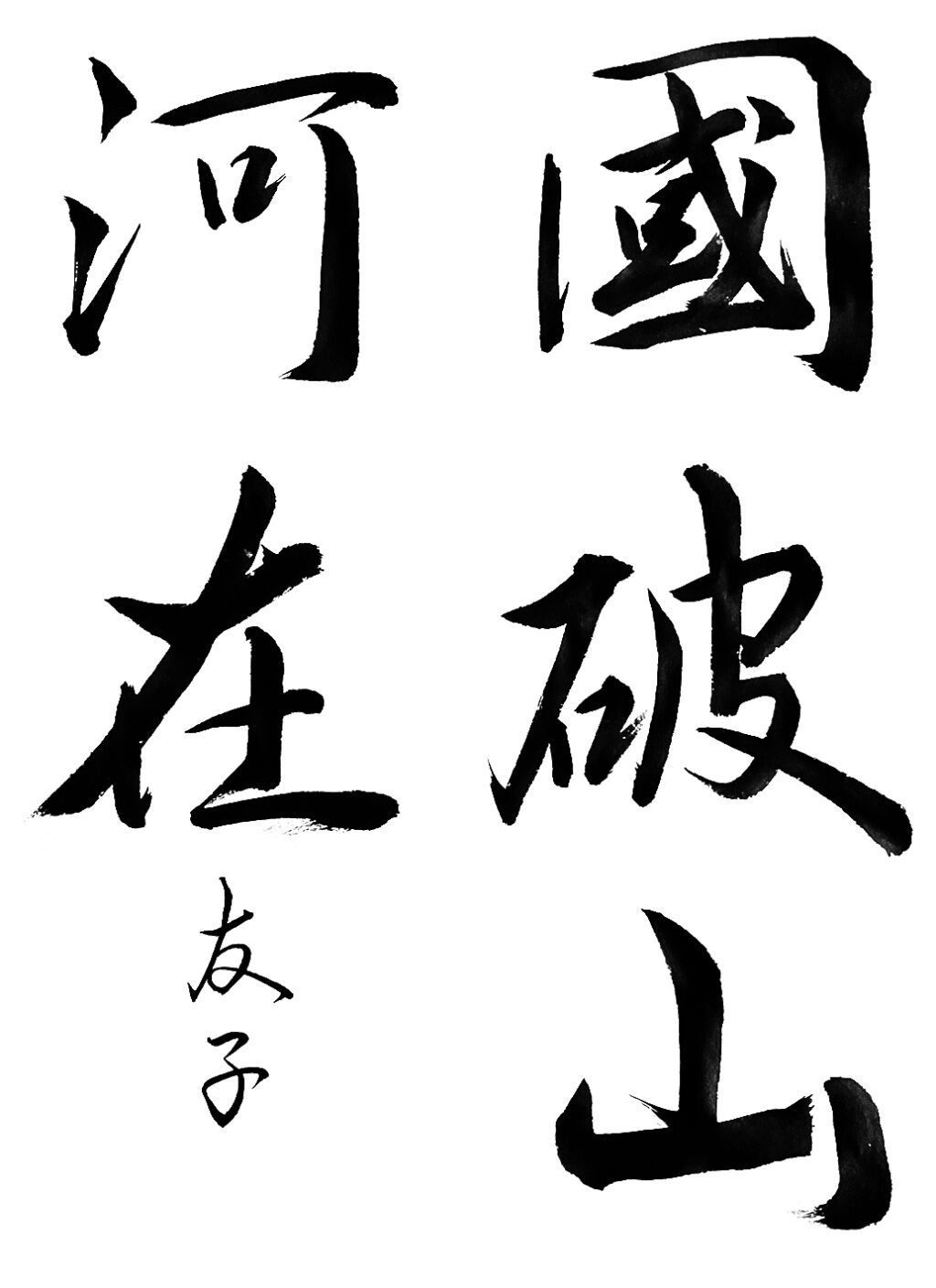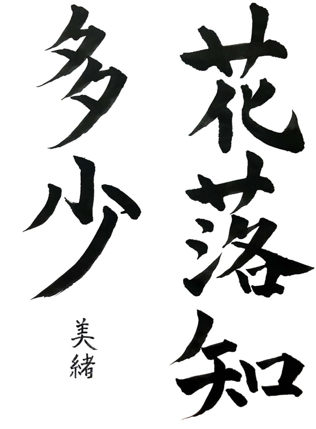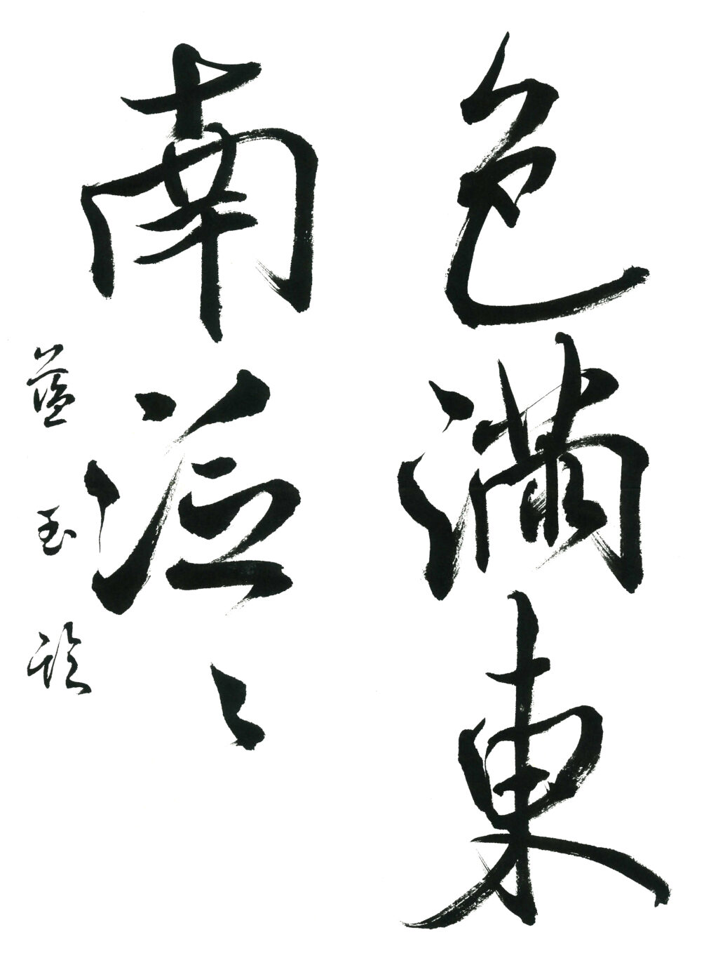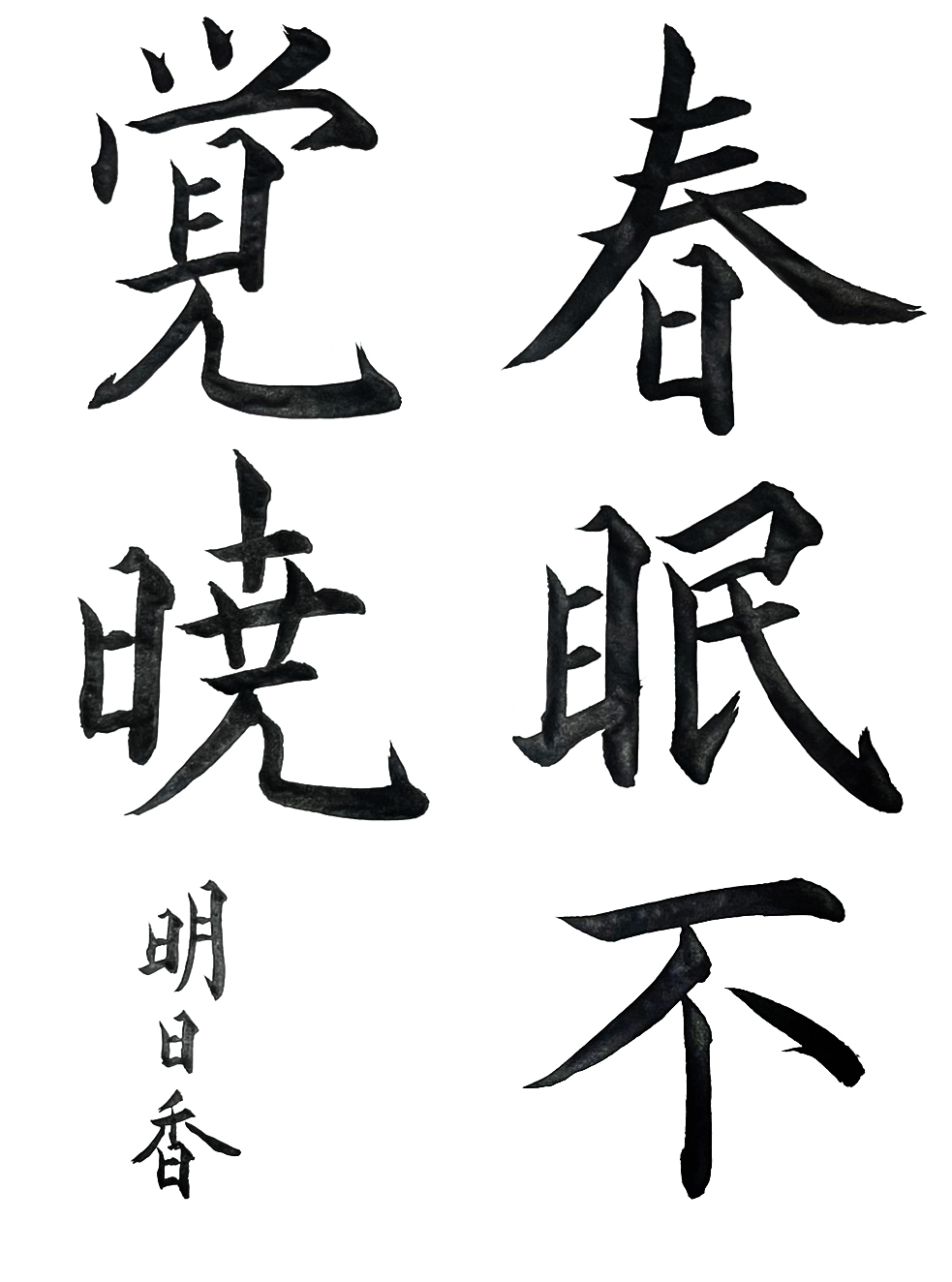 【秀逸】各(かく)文字の造形(ぞうけい)の特徴(とくちょう)を活かした表現(ひょうげん)力と、多様な線の使い方が出てきて、とても見応(ごた)えのある作品になりました。小筆書きの線質(せんしつ)も向上しており、ますます上達(じょうたつ)が楽しみです。