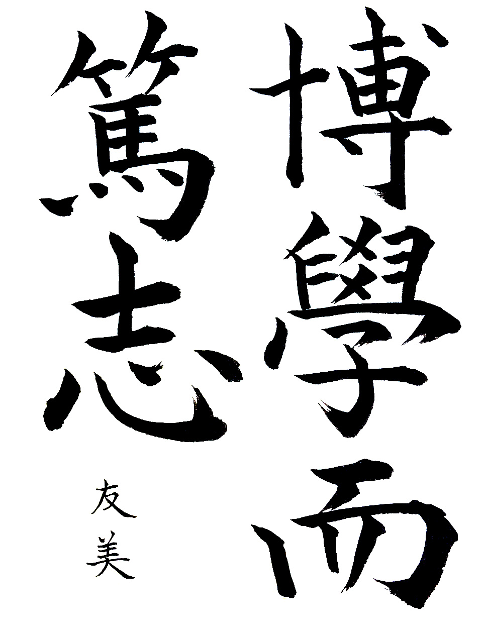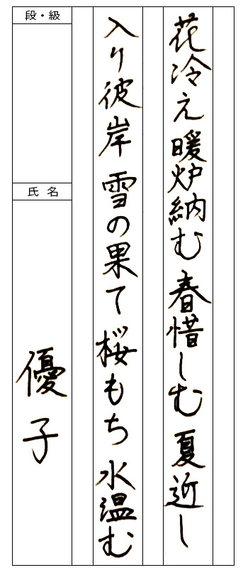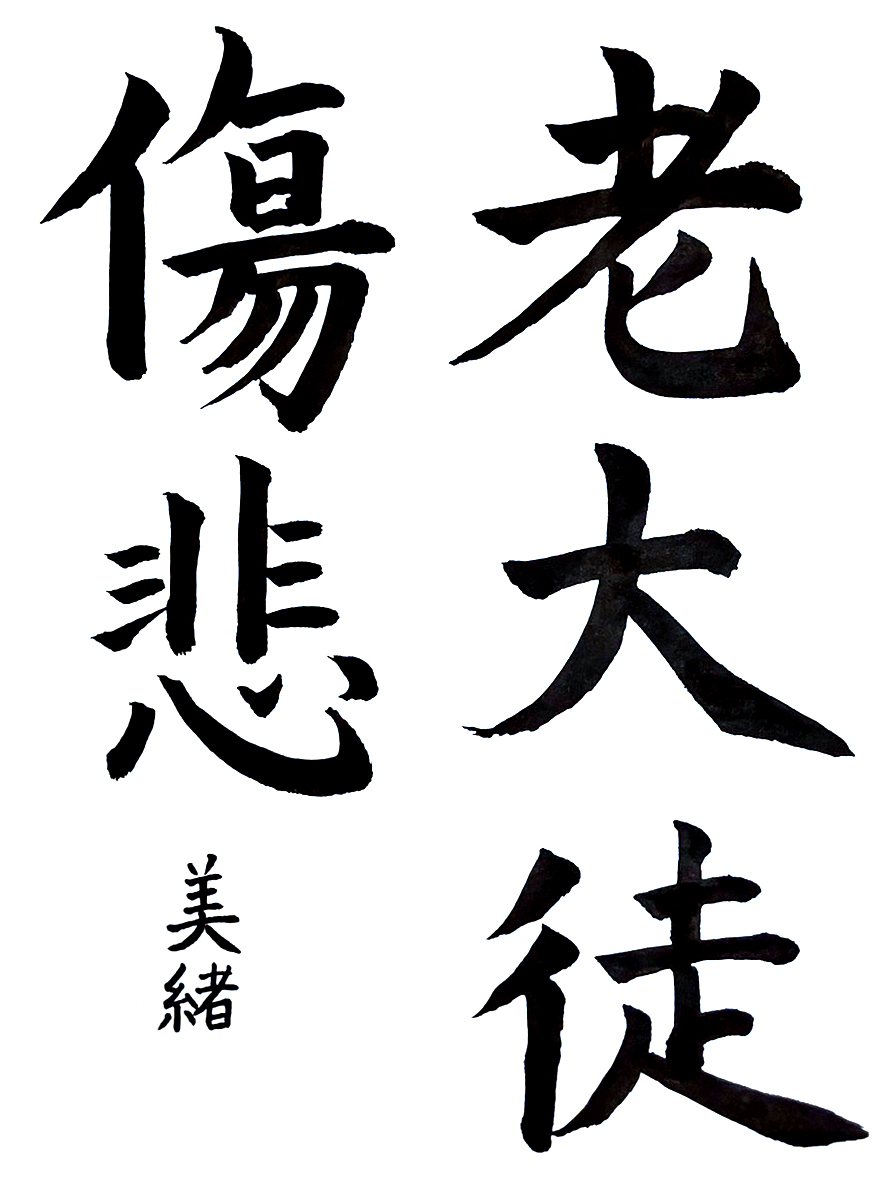【秀作】線質に切れ味を感じることができ、用筆法の向上がうかがえます。各文字の大きさのバランスや余白の調整により、さらに造形は整いますので、今後のさらなる上達を楽しみにしています。