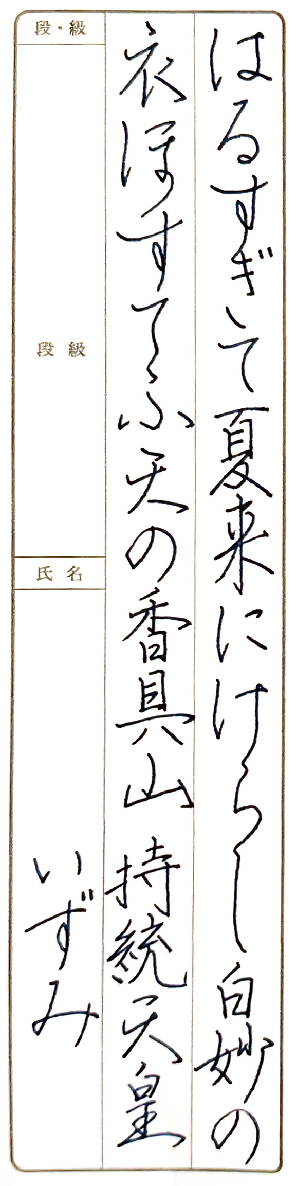 【秀逸】古筆原本を丁寧に鑑賞し、線の方向性を的確に表現されたことで、各行に流れと動きが生まれました。一方で、行間の余白にやや間延びを感じる部分も見受けられましたので、今後は紙面全体の構成力のさらなる向上に期待しています。