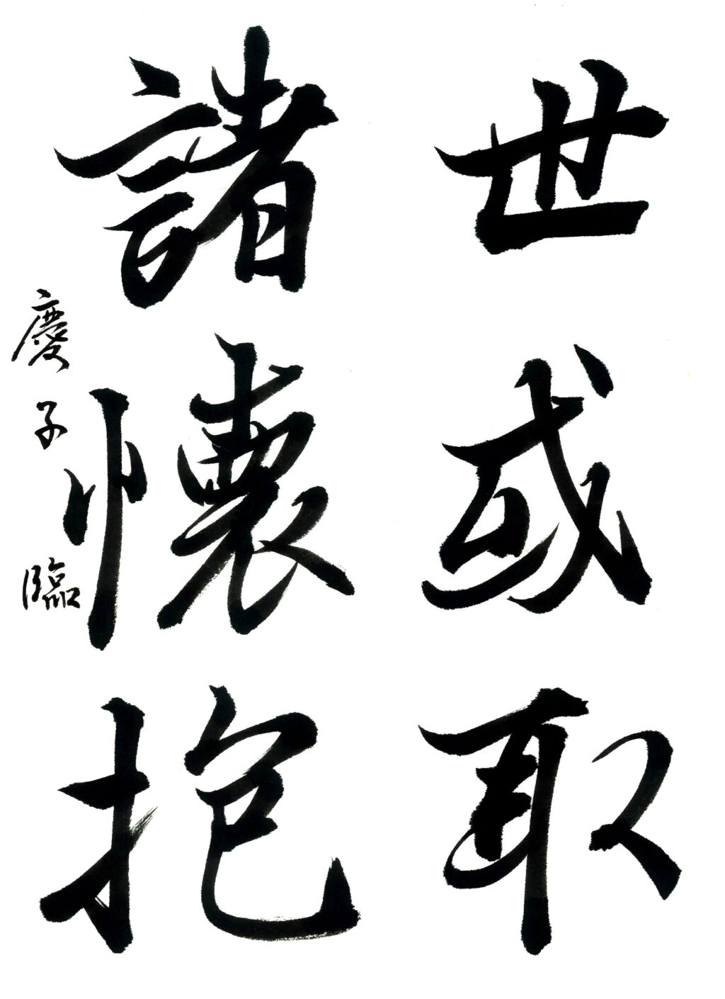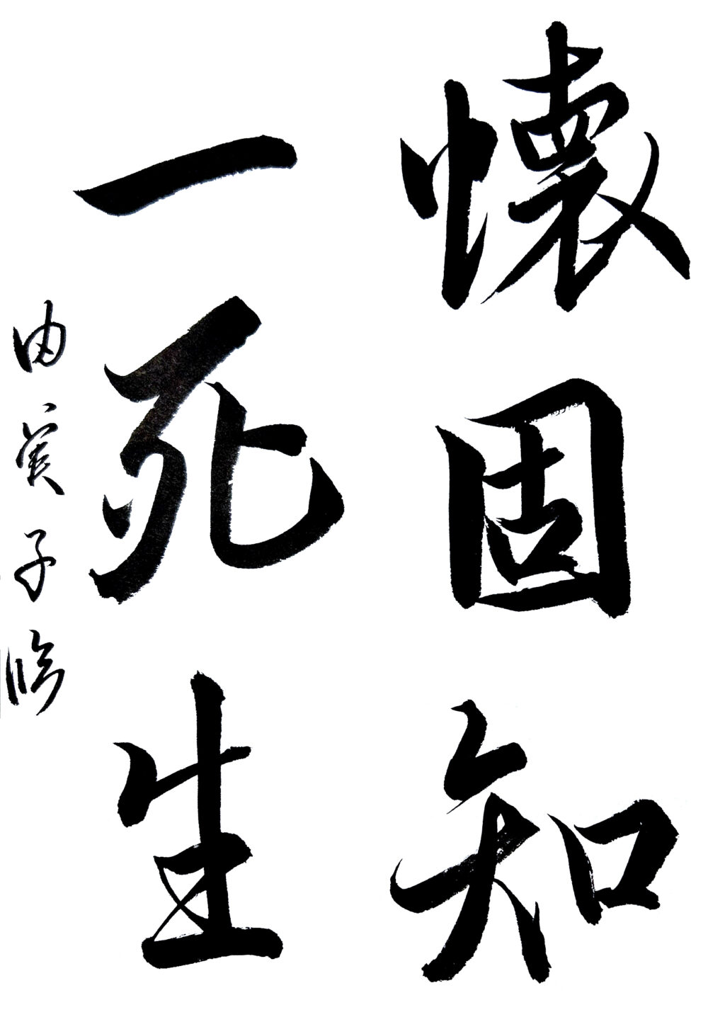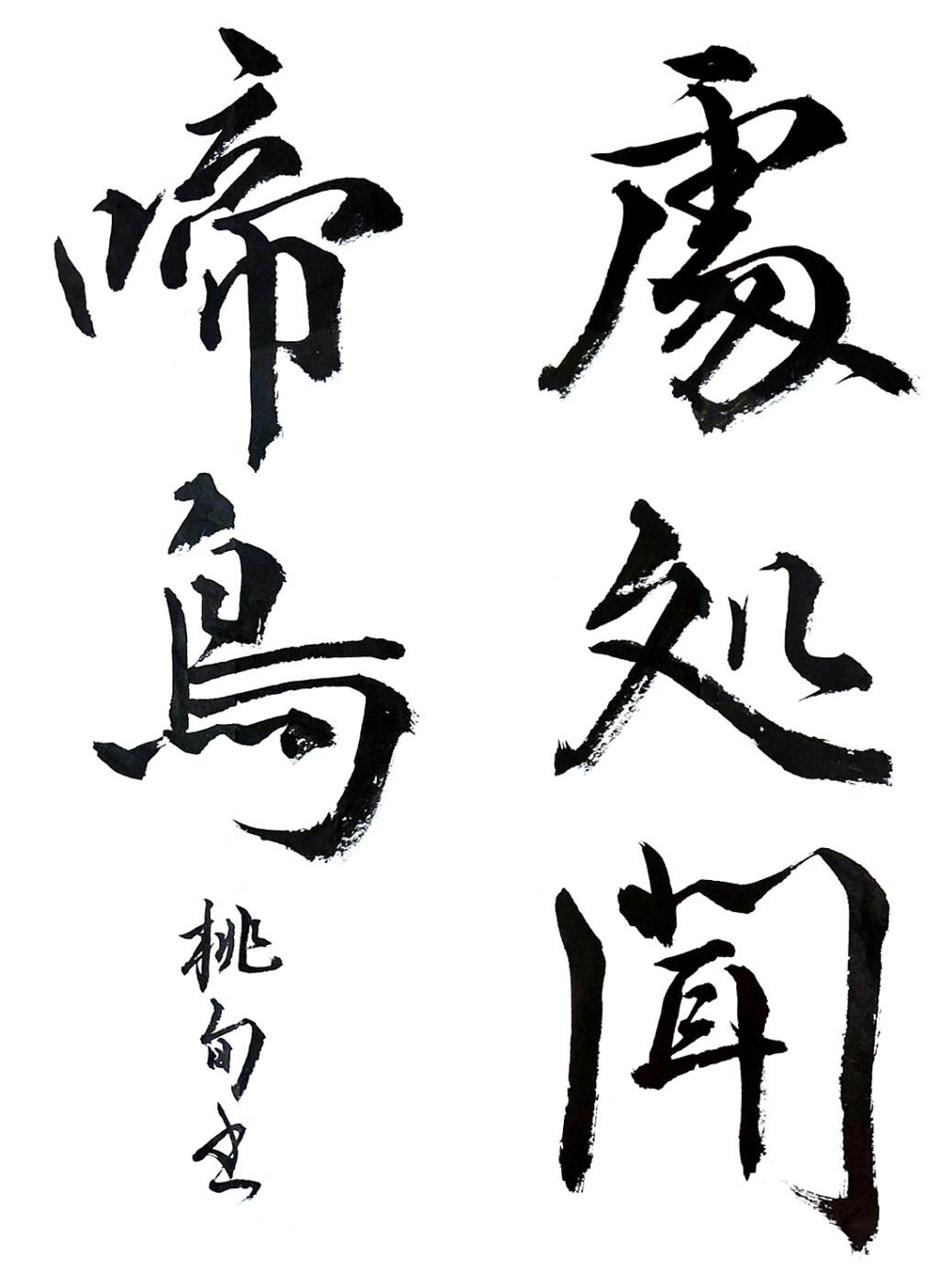 【秀作】穂先の効いた書きぶりにより、余白の確保も活きました。あとは各文字の大きさの調整と、字間の余白を意識した収め方により、紙面全体がさらに明るくなりますので、引き締まった書きぶりに期待しています。